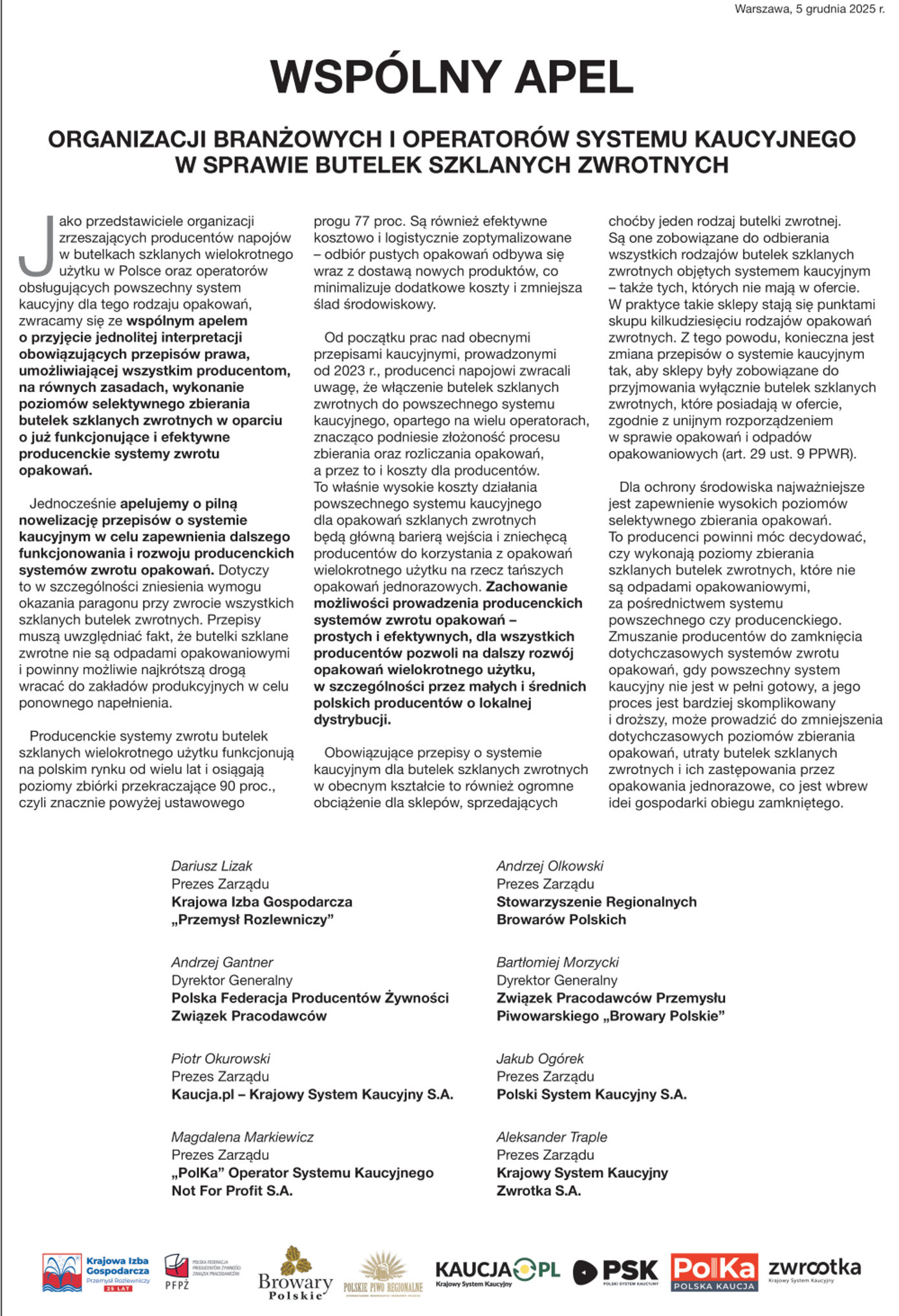 Wspólny apel organizacji branżowych i operatorów systemu kaucyjnego w sprawie butelek szklanych zwrotnych