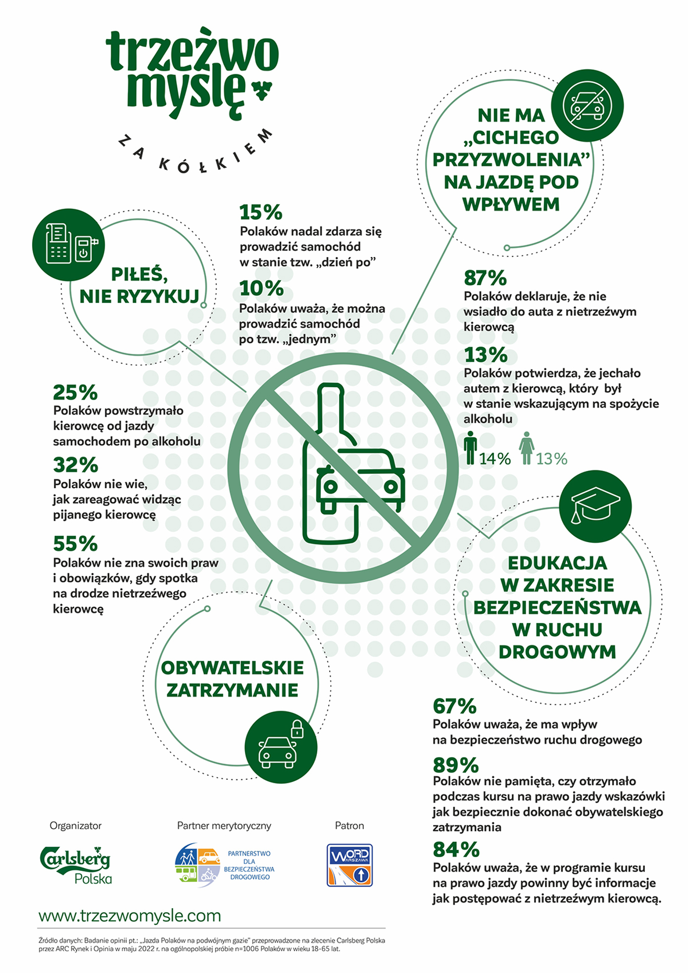 25% ankietowanych powstrzymało kierowcę od jazdy po alkoholu, natomiast 32% przyznaje, że nie wiedziałoby co zrobić będąc świadkiem takiej sytuacji. Blisko 90% Polaków nie pamięta, czy otrzymało podczas kursu na prawo jazdy wskazówki jak bezpiecznie dokonać obywatelskiego zatrzymania, zaś 55% nie wie jakie ma prawa a jakie obowiązki w sytuacji spotkania na drodze nietrzeźwego kierowcy. Natomiast aż 84% Polaków uważa, że w programie kursu na prawo jazdy przyszli uczestnicy ruchu drogowego powinni być uczeni jak postępować z nietrzeźwym kierowcą.